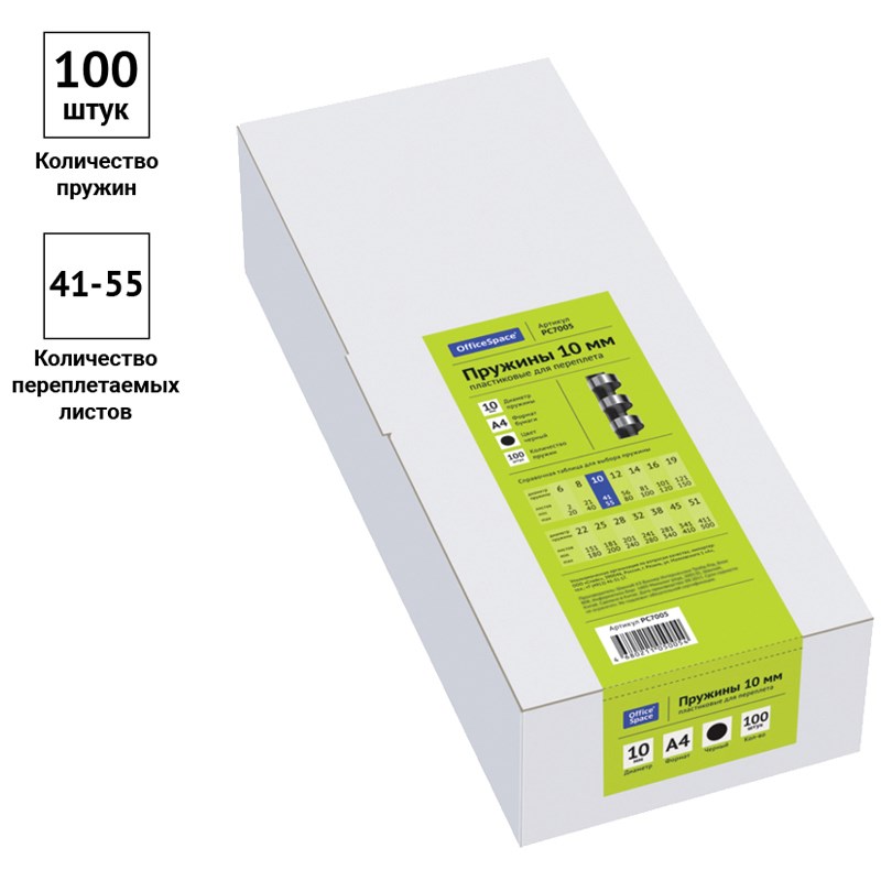 Пружины пласт. для переплета 10мм, черные, комплект 100 шт. (PC7005, OfficeSpace) для сшивания 41-55л.